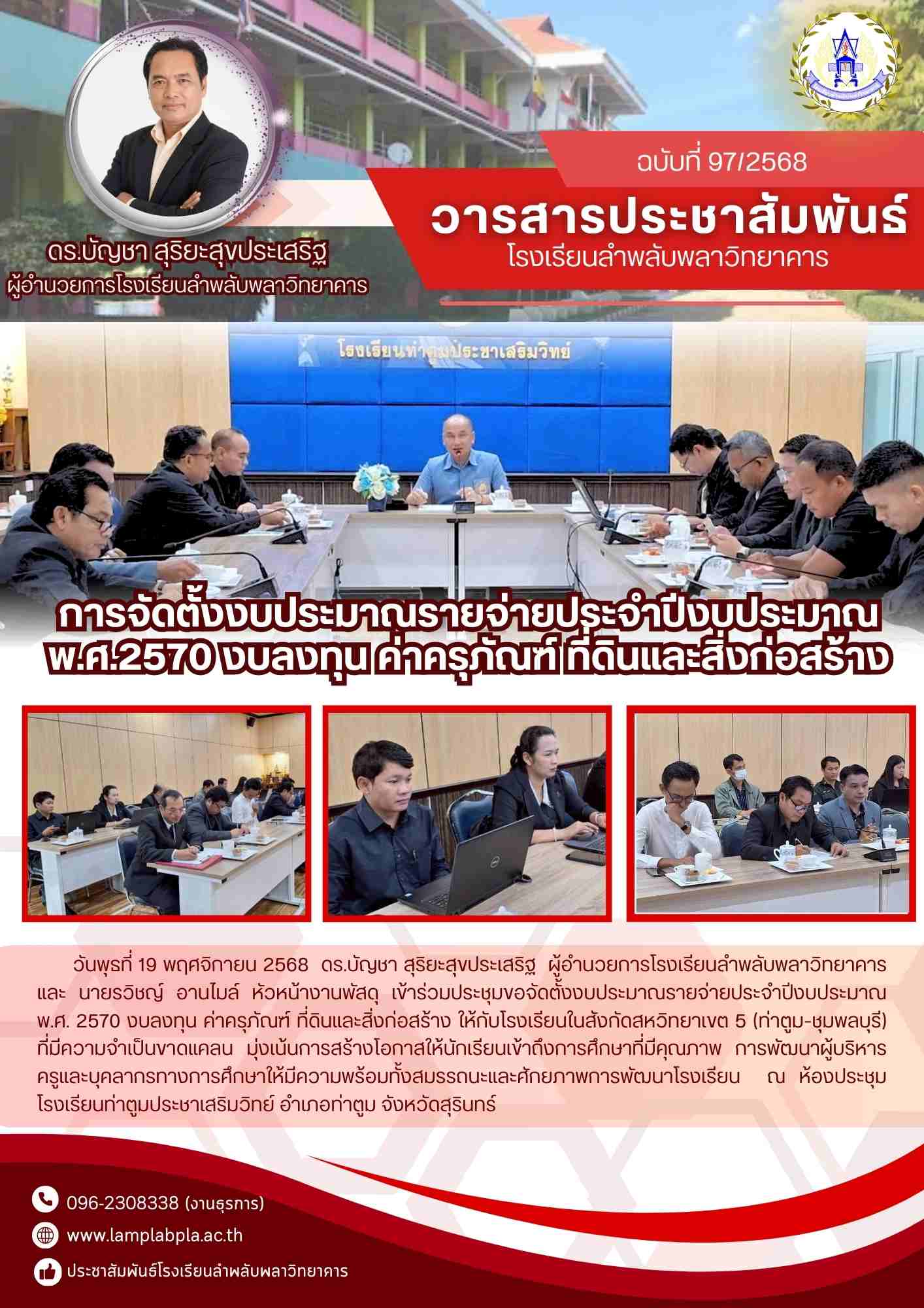 ในวันที่ 19 พ.ย 2568 ท่านผู้อำนวยการและครูผู้รับผิดชอบงานพัสดุ ณ รร.ท่าตูมประชาเสริมวิทย์ประชุมการจัดตั้งงบประมาณรายจ่ายประจำปีงบประมาณ พ.ศ.2570