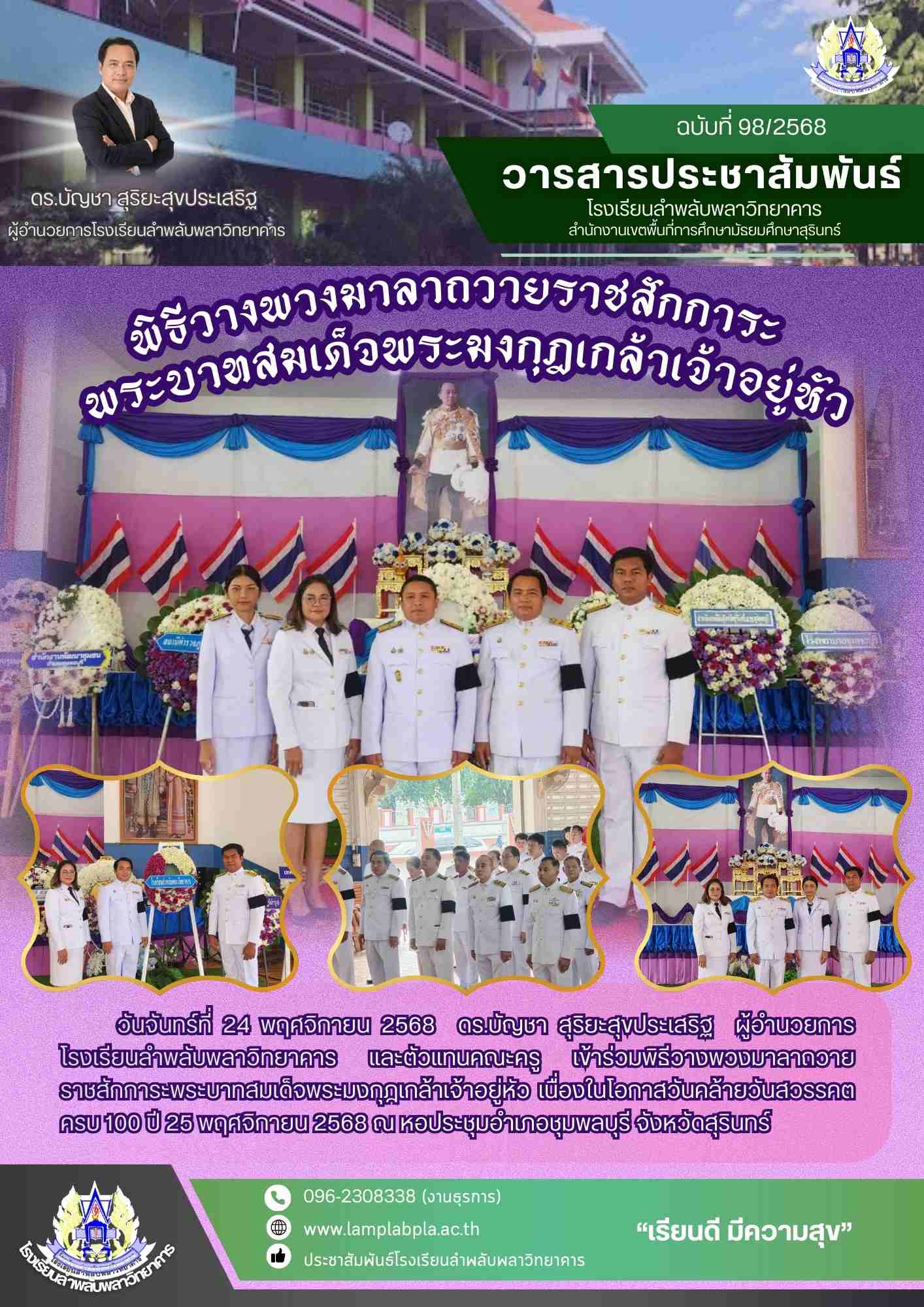วันจันทร์ที่ 24 พฤศจิกายน 2468 ผู้อำนวยการและคณะครูร่วมพิธีวางพวงมาลาถวายราชสักการะพระบาทสมเด็จพระมงกุฏเกล้าเจ้าอยู่หัว ร.6 ณ หอประชุมที่ว่าการอำเภอชุมพลบุรี